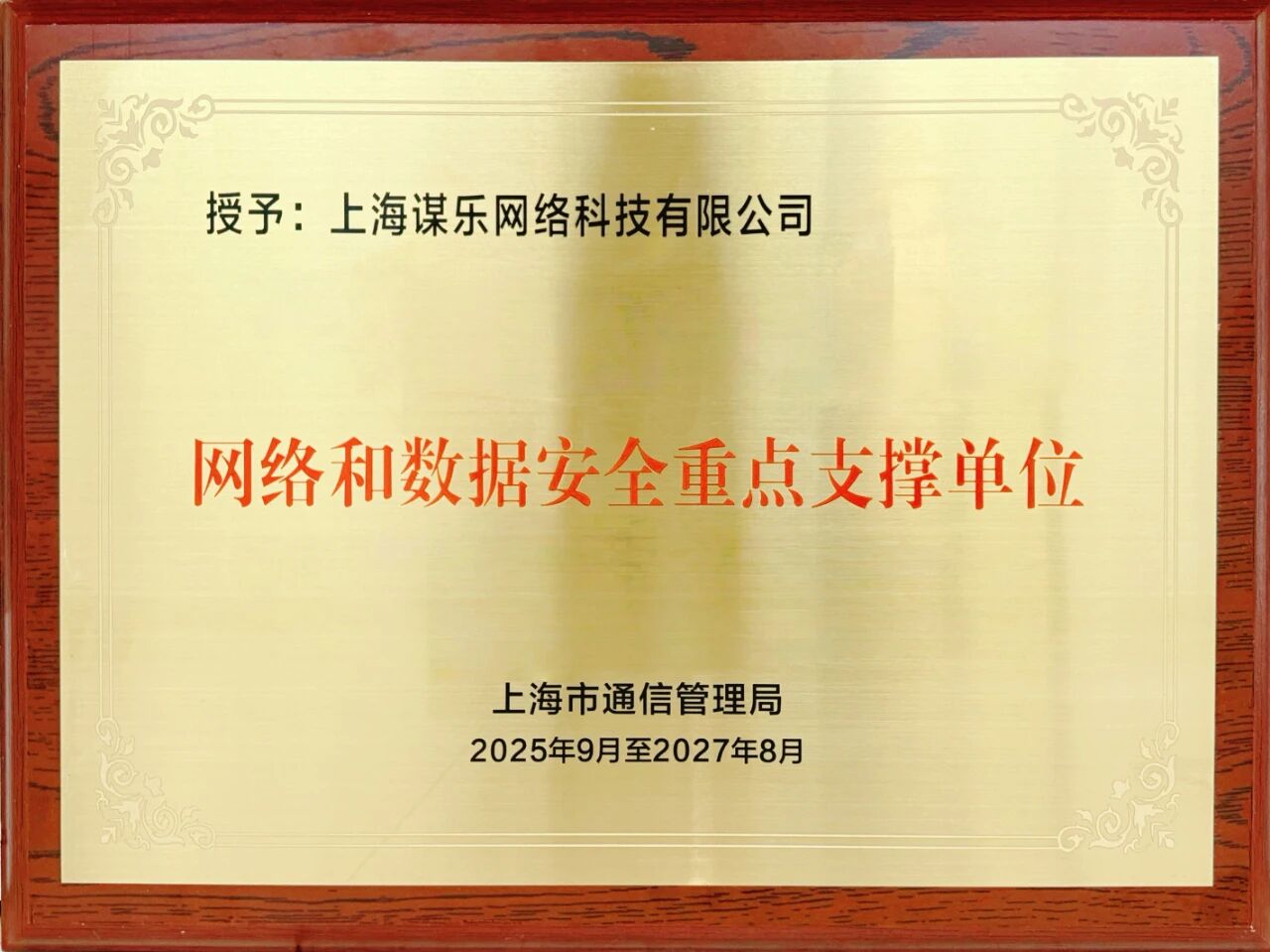 近日,由上海市通信管理局主办,上海市互联网协会、中国移动通信集团上海有限公司承办的“2025年国家网络安全宣传周上海地区电信日主题活动”拉开帷幕。在本次主题活动中,为上海市通信管理局2025年网络和数据安全支撑单位进行授牌。其中,松江区广富林街道商会理事企业上海谋乐网络科技有限公司凭借过硬的数据安全支撑能力与丰富的行业服务经验,成功入围上海市通信管理局2025年网络和数据安全重点支撑单位。