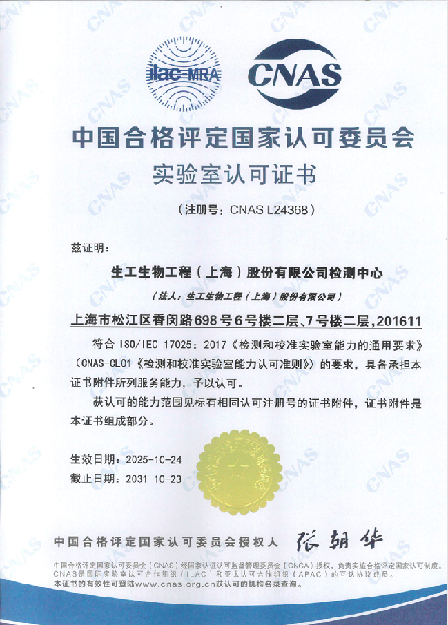 此次通过CNAS认可,不仅是对生工生物长期以来坚守质量承诺的权威鉴证,更是公司技术实力与质量管理迈向新高度的关键里程碑。企业将以CNAS认可为新起点,持续以CNAS认可标准为准则,在基因合成与基因检测双赛道协同发力,不断提升检测服务的专业性、合规性与可靠性。