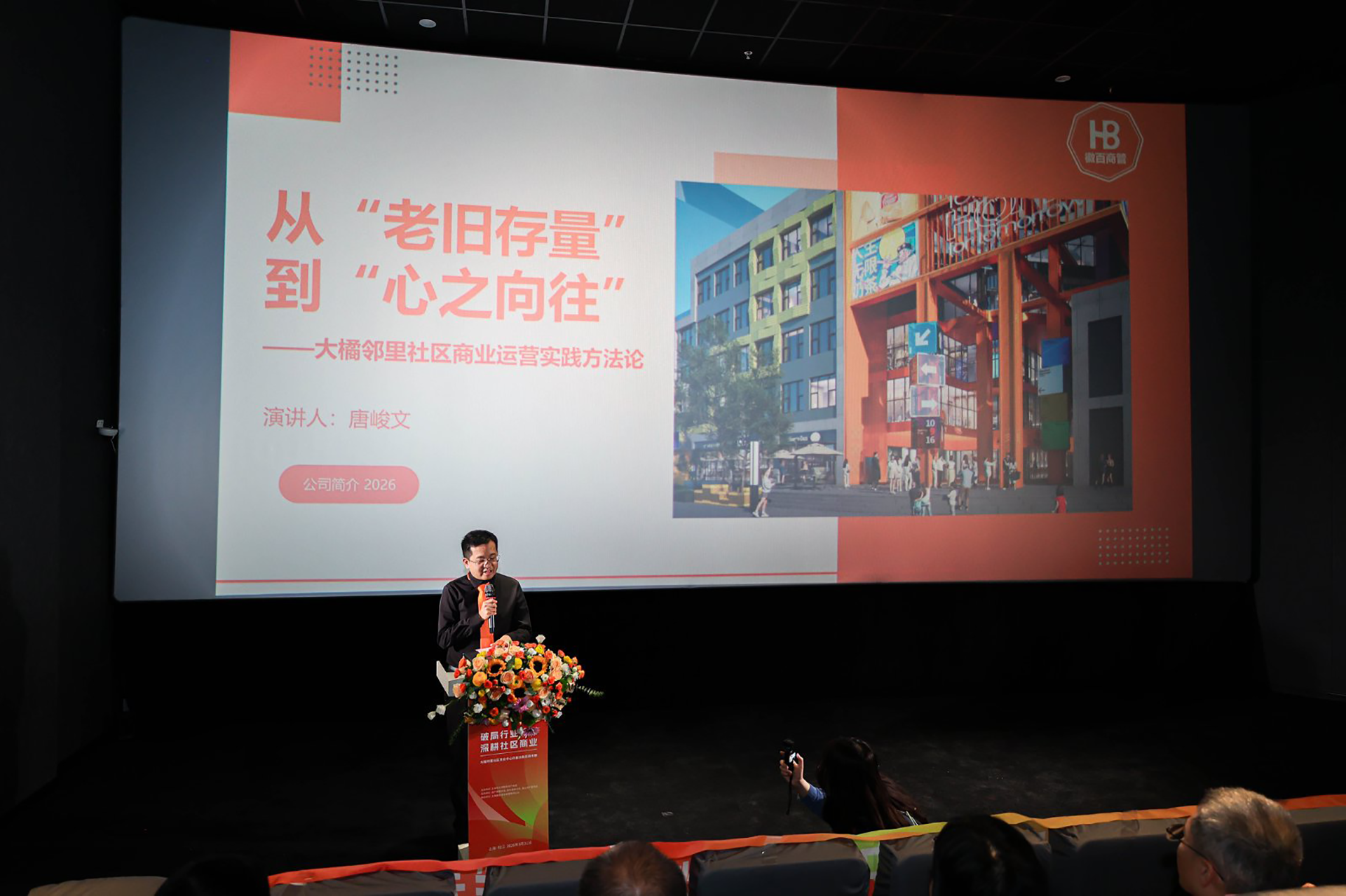 上海徽百商业管理有限公司联合创始人、副总经理唐峻文以《从“老旧存量”到“心之向往”——大橘邻里社区商业运营实践方法论》为题展开分享。他阐述了大橘邻里“点亮社区,共创美好生活”的使命,围绕大橘艺术中庭、大橘夜巷、小橘子亲子街区、大橘书屋、大橘市民活动中心五大创新文化空间,践行“欢聚在大橘”“助商在大橘”“有爱在大橘”三大运营策略,扎根社区、服务居民。