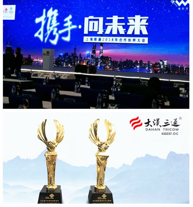 2月1日,在上海联通“携手向未来”2018合作伙伴大会上,浦东工商联会员企业、上海大汉三通通讯股份有限公司荣获上海联通“政企客户优秀代理商金奖”、“企代理商最佳成长三等奖”。