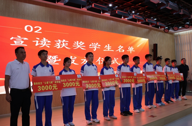 仪式上,春秋航空为60名高二、高三优秀学生每人发放3000元奖学金,并向30名毕业生每人发放5000元奖学金。获奖学生代表衷心感谢春秋航空的慷慨支持,表示将勤奋学习、不断进取,以优异成绩回报社会关怀。