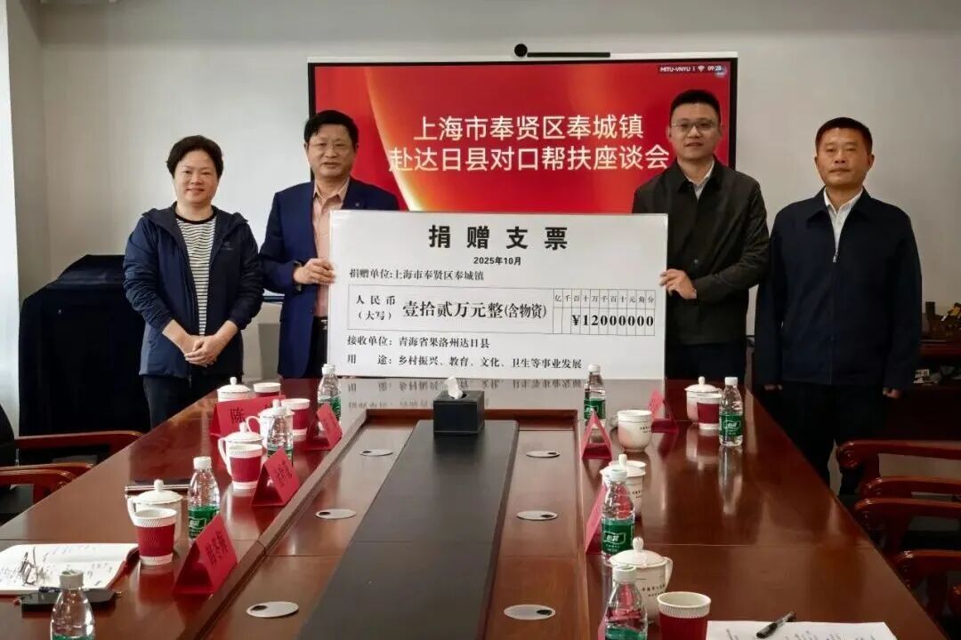 考察期间,奉城商会举行了爱心捐赠活动。上海申驰实业股份有限公司、上海齐达重型装备有限公司、上海洪铺钢结构工程有限公司、上海伯瑞制动器有限公司、上海雅米鼎宏业建设发展有限公司5家企业慷慨解囊,共同捐赠现金10万元;商会同时向达日县养老院捐赠了羽绒服、床上用品及投影仪等爱心物资。此次捐赠现金及物资总计价值12万元,并通过举牌仪式,将这份承诺融入达日县乡村振兴、教育文化等事业的宏伟蓝图,助力当地共建美好生活。