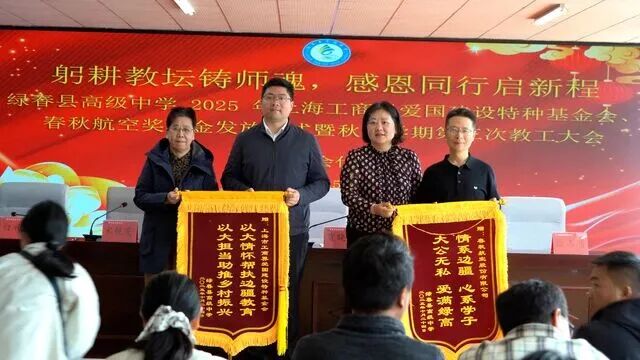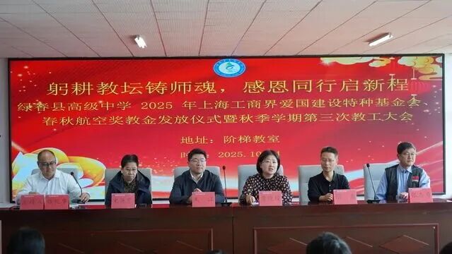 10月24日上午,云南绿春县高级中学举行“2025年上海工商界爱国建设特种基金会、春秋航空奖教金发放仪式”。本次活动不仅是对优秀教师的鼓励,更是对七年来沪滇两地山海情深、共筑教育梦的温暖回顾与崭新展望。绿春县委常委、副县长朱江出席会议。