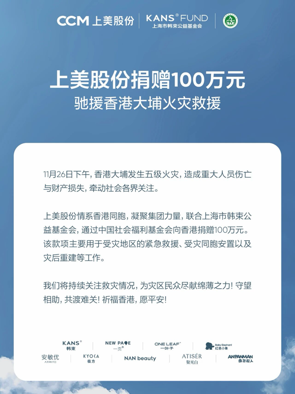 上美股份情系香港同胞,凝聚集团力量,联合上海市韩束公益基金会,通过中国社会福利基金会向香港捐赠100万元。该款项主要用于受灾地区的紧急救援、受灾同胞安置以及灾后重建等工作。