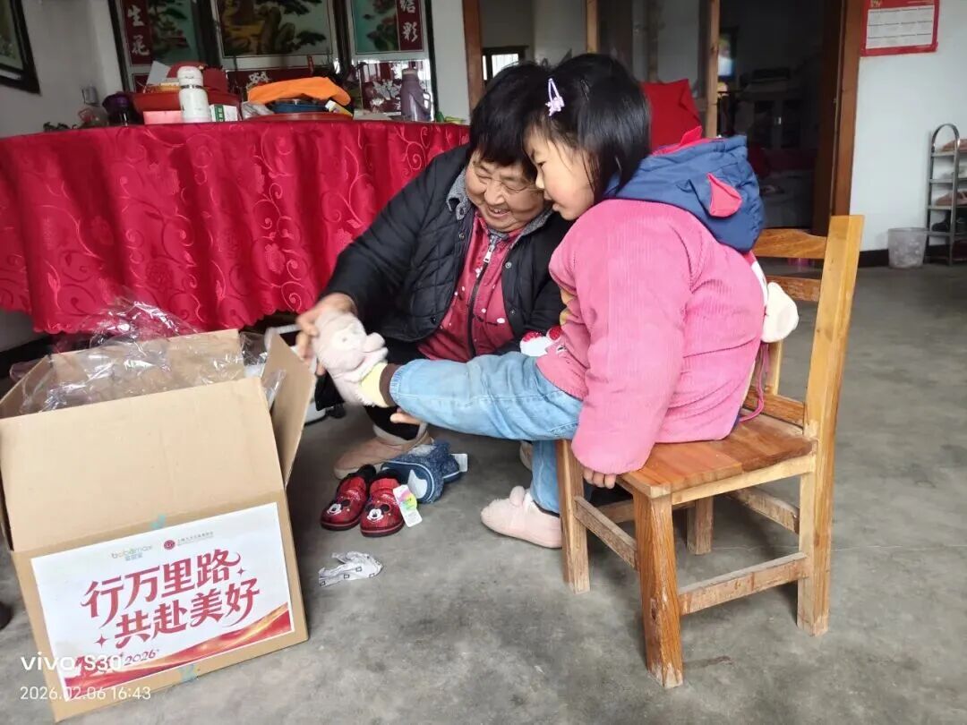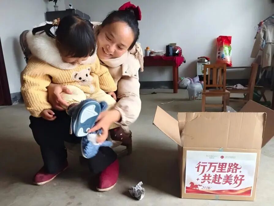 物资发放现场的一幕幕温暖瞬间,让所有付出都更具意义:家长俯身细系鞋带,孩子踏鞋雀跃欢笑,亲子相视的瞬间满是治愈。