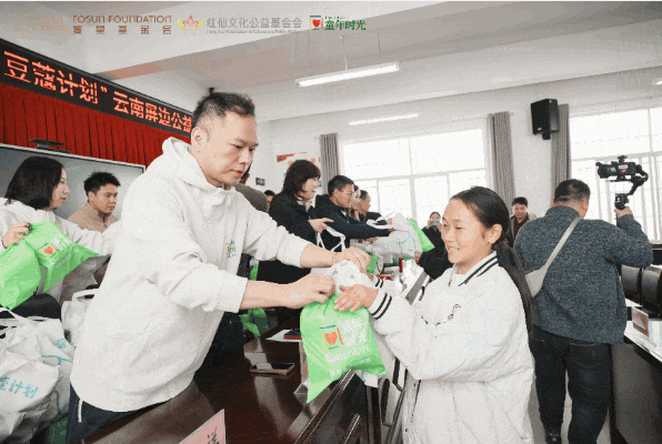 屏边县委常委、副县长饶斌,县委卫健工委书记、县卫健局党组书记王传千,复星基金会联席执行秘书长俞曦,红仙文化公益基金会秘书长刘爱舟,复星商社副总裁、健康消费品事业部总经理张晓清等为女孩们送上豆蔻关爱包和营养包。