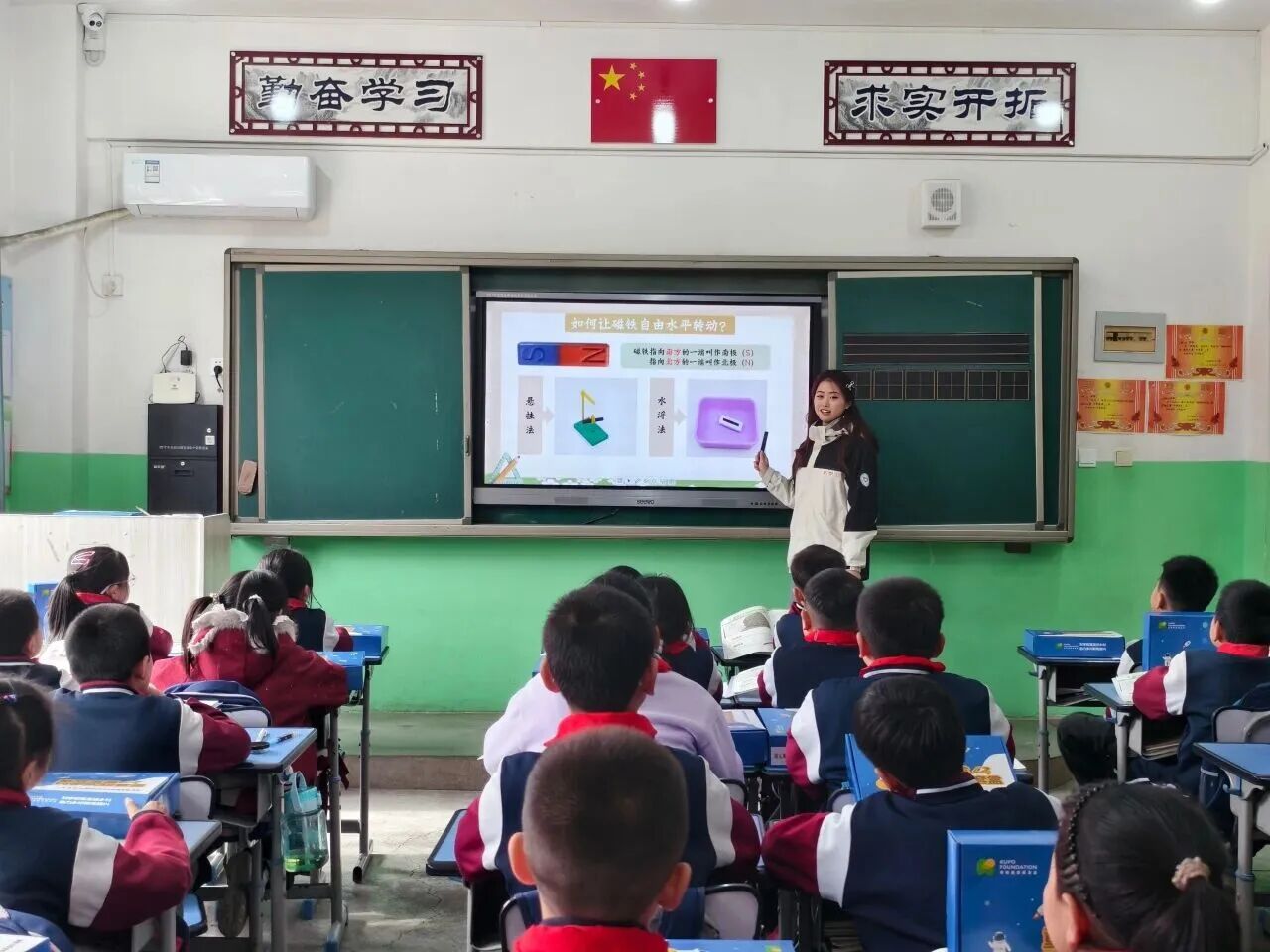 随后,“温秦润心·童梦启智”趣味科学教育系列课堂第一课正式开讲。研支团成员龙婷以历史小故事引入实验主题《利用磁铁辨别方向》,将抽象的科学原理转化为可视可感的实验现象。学生们认真聆听实验步骤,仔细观察操作演示,在研支团成员的分组指导下亲手完成实验。从小心翼翼组装器材到成功完成实验步骤,孩子们在实践中体会着探索的乐趣,科学探究的种子在动手操作中悄然萌发。