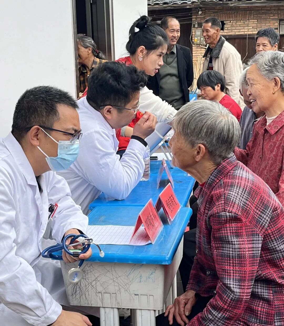 桥头村活动前期,社工团队逐户走访摸排,精准掌握老人实际需求。现场设立义诊、义剪专区,医护人员提供健康检查与指导,社工为独居、高龄老人开展情感疏导并建立服务档案,确保后续跟进。