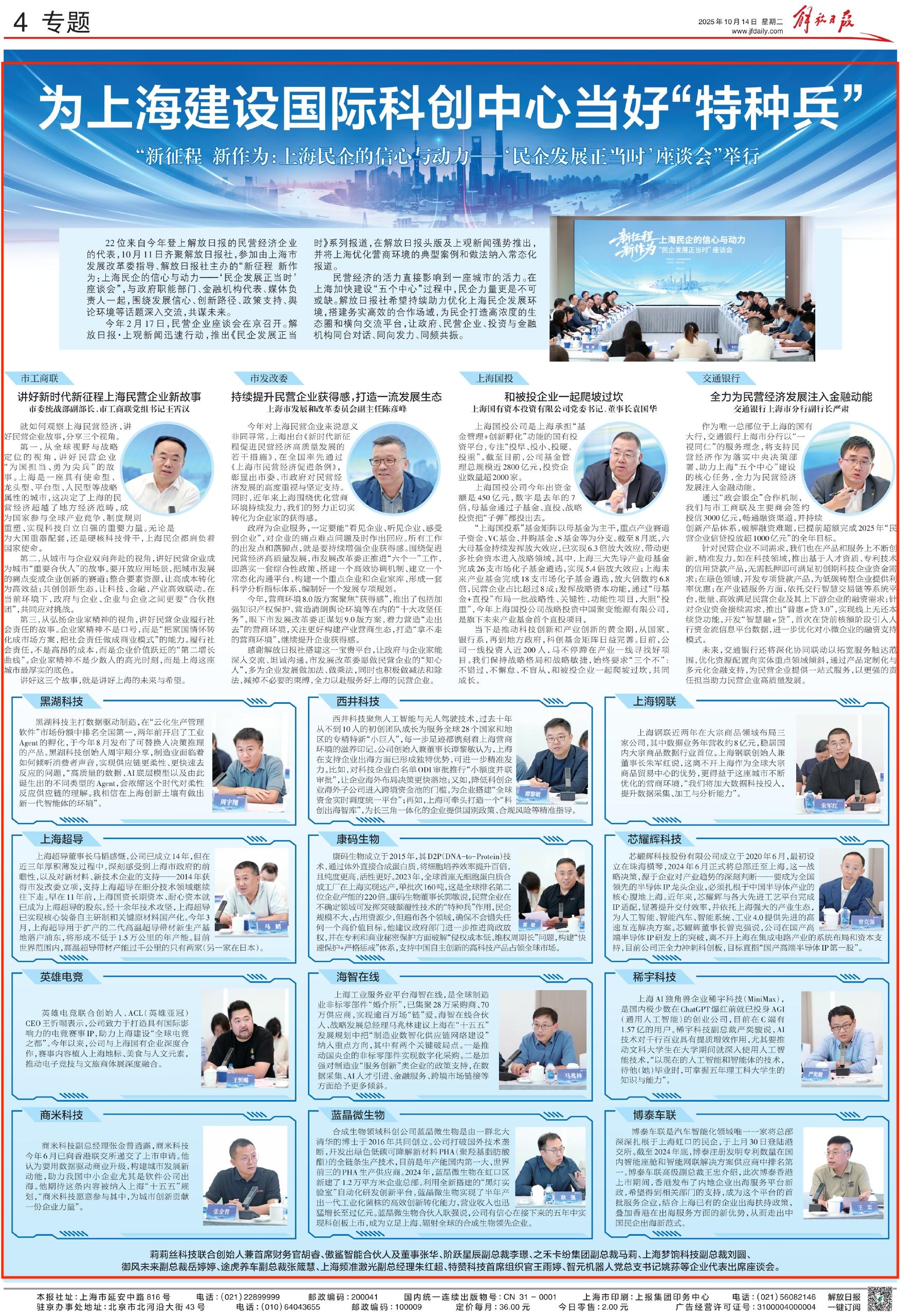 22位来自今年登上解放日报的民营经济企业的代表,10月11日齐聚解放日报社,参加由上海市发展改革委指导、解放日报社主办的“新征程 新作为:上海民企的信心与动力——‘民企发展正当时’座谈会”,与政府职能部门、金融机构代表、媒体负责人一起,围绕发展信心、创新路径、政策支持、舆论环境等话题深入交流,共谋未来。