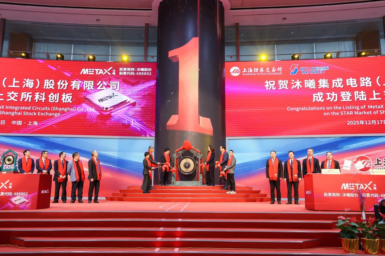 12月17日,沐曦股份正式在上海证券交易所科创板挂牌上市。上海市委统战部副部长、市工商联党组书记王霄汉,香港科技大学首席副校长郭毅可,上海证券报社党委书记、董事长叶国标,电子科技大学校长胡俊等出席上市仪式。沐曦集成电路(上海)股份有限公司创始人、董事长兼总经理陈维良,华泰联合证券有限责任公司党委书记、董事长江禹在仪式上致辞。