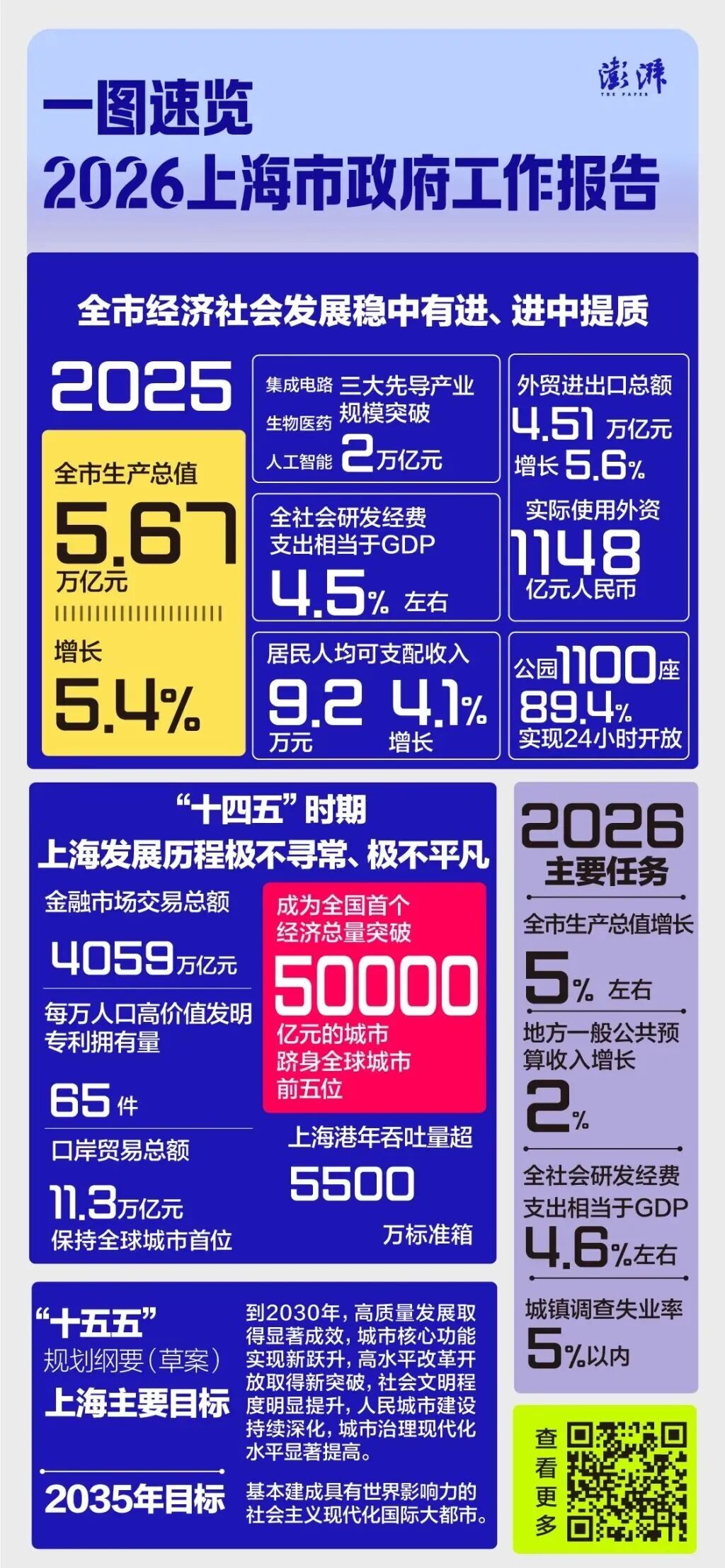 龚正说,提请本次大会审查的《上海市国民经济和社会发展第十五个五年规划纲要(草案)》,提出了“十五五”时期上海经济社会发展的主要目标和任务,还展望了到2035年的奋斗目标。