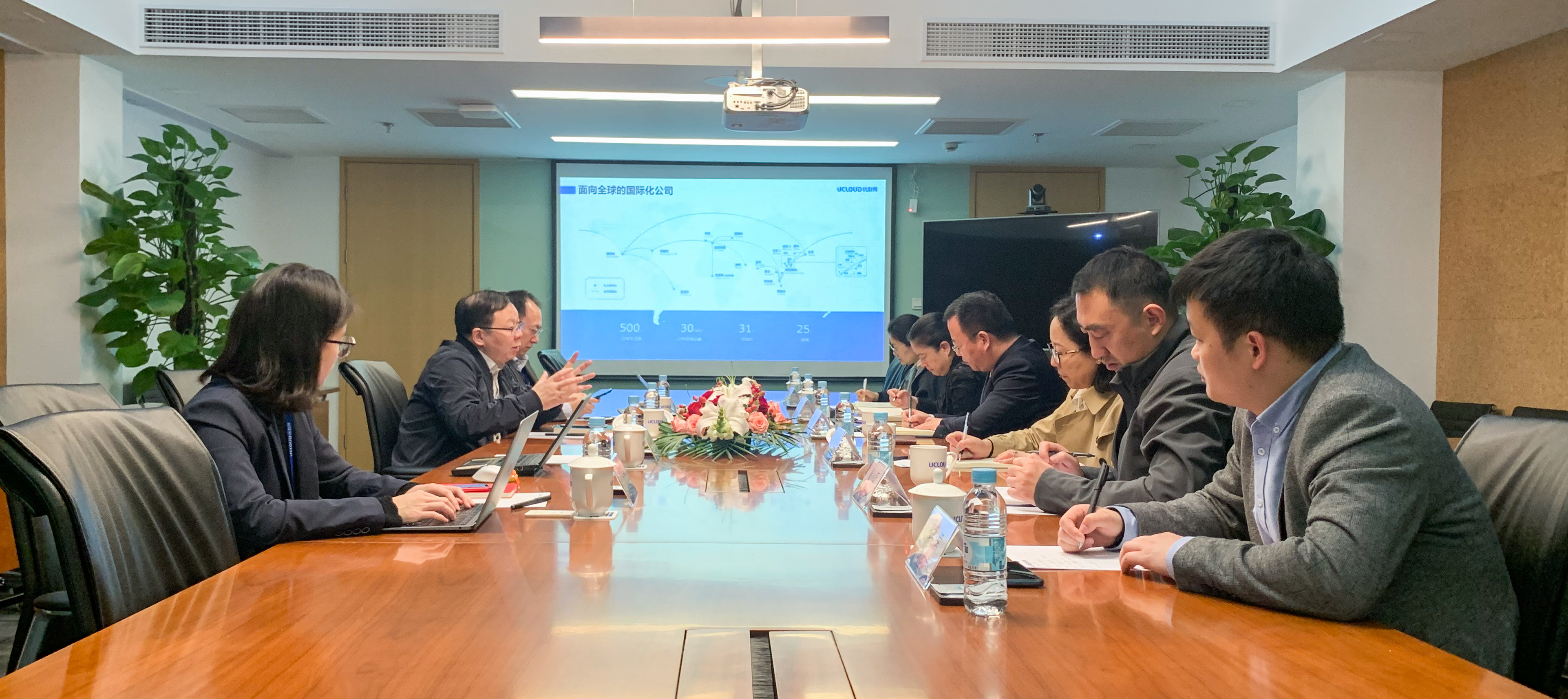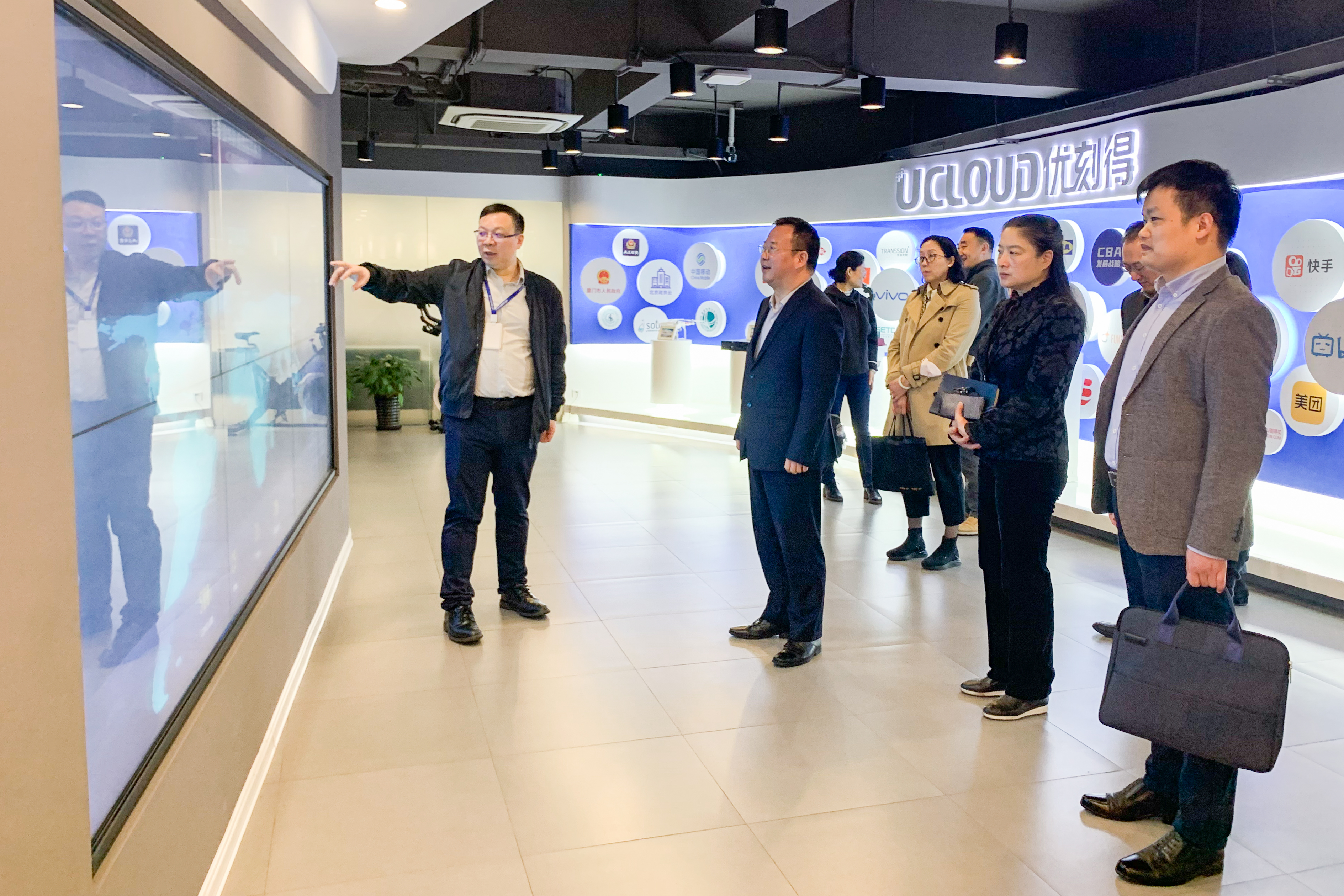 在优刻得科技股份有限公司,调研组一行在CEO季昕华的介绍下参观了企业展厅,详细了解了优刻得使用自主研发的云计算产品服务政府用户、企业用户发展的情况。