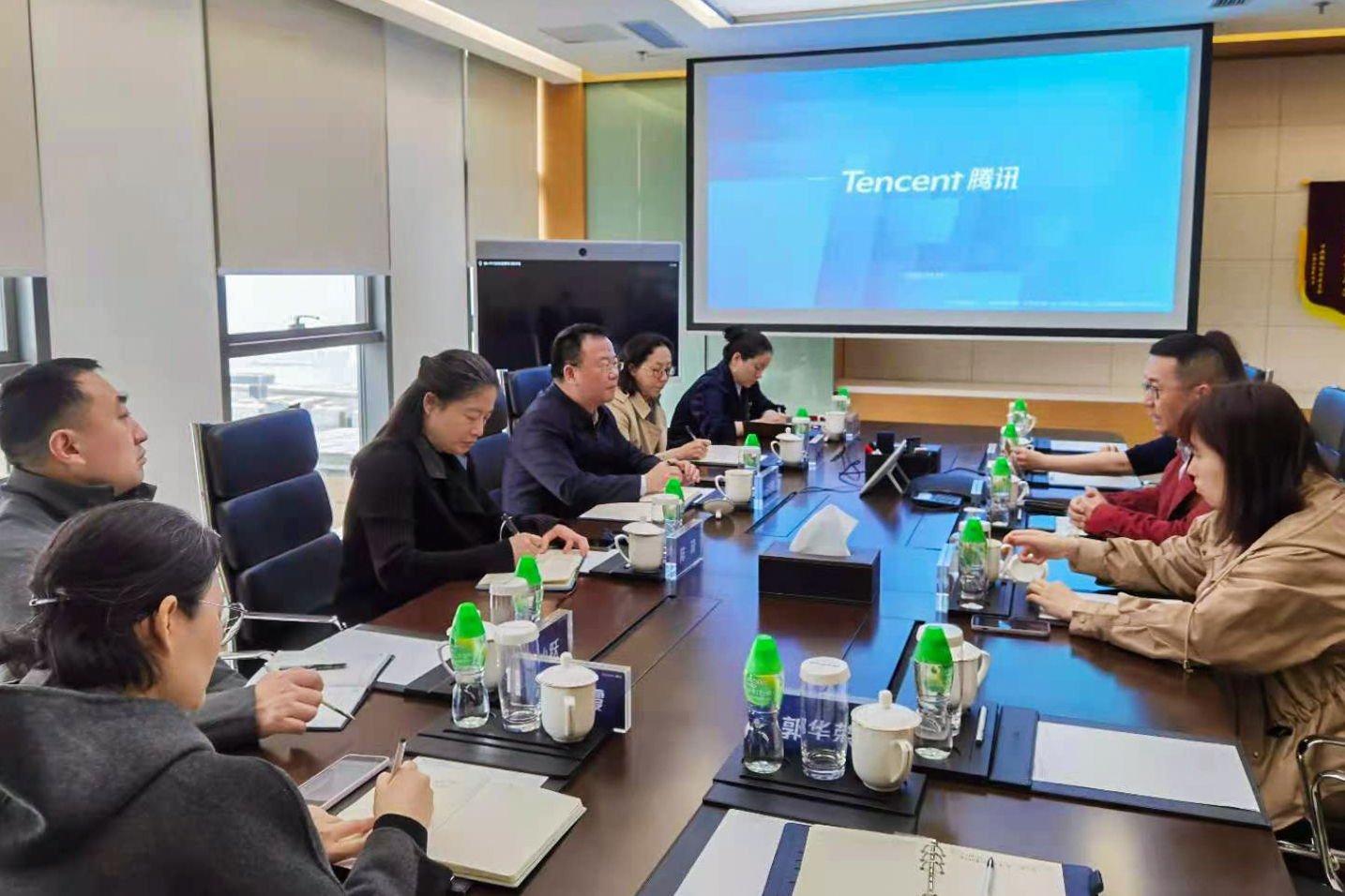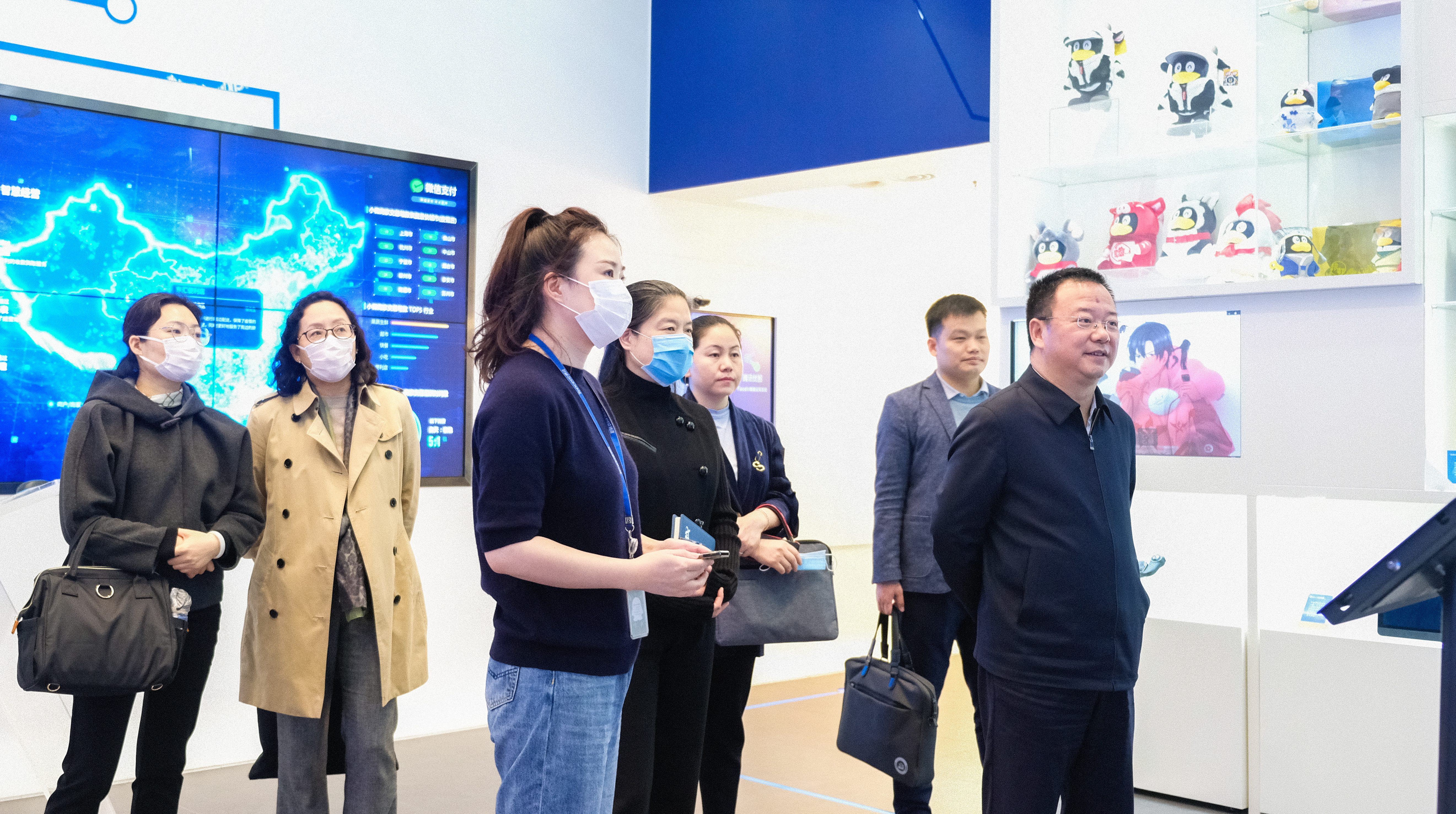 在腾讯科技(上海)有限公司,腾讯公司副总裁、上海公司总经理张立军带领调研组一行参观了腾讯展示厅,了解腾讯公司的发展历程、产品星云图以及腾讯在AI+智慧城市、智慧政务、网络安全等方面的创新应用。在产品交互展示区,大家与腾讯开发的AI智能产品进行了有趣的互动。