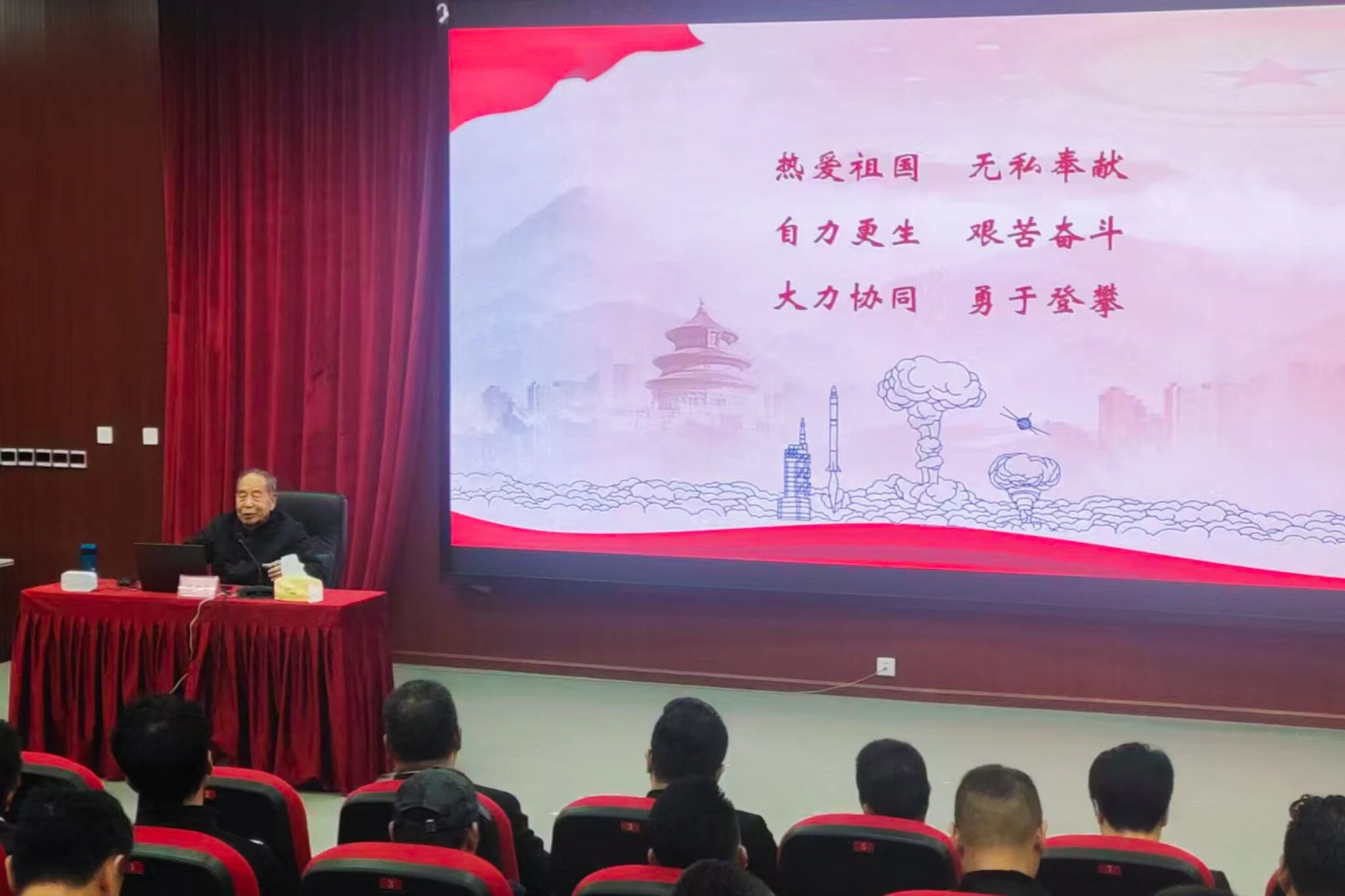 中国工程物理研究院原副院长尚林盛以《我‘核’我们的故事》为题展开授课,从领导者率先垂范、科学家攻坚克难、工人默默耕耘到全国人民协同支持的多维视角,将“两弹一星”的峥嵘岁月与新时代干事创业深度融合。
