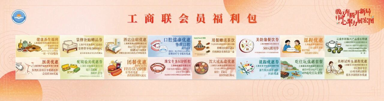 为进一步团结凝聚会员力量,构建互利共赢的良好社群生态,促进会员间的优势互补与协同发展,黄浦区工商联于2025年启动了会员企业共享资源征集工作,并在本次联谊活动中以“工商联会员新春福利包1.0”的形式向全体会员进行发布。
