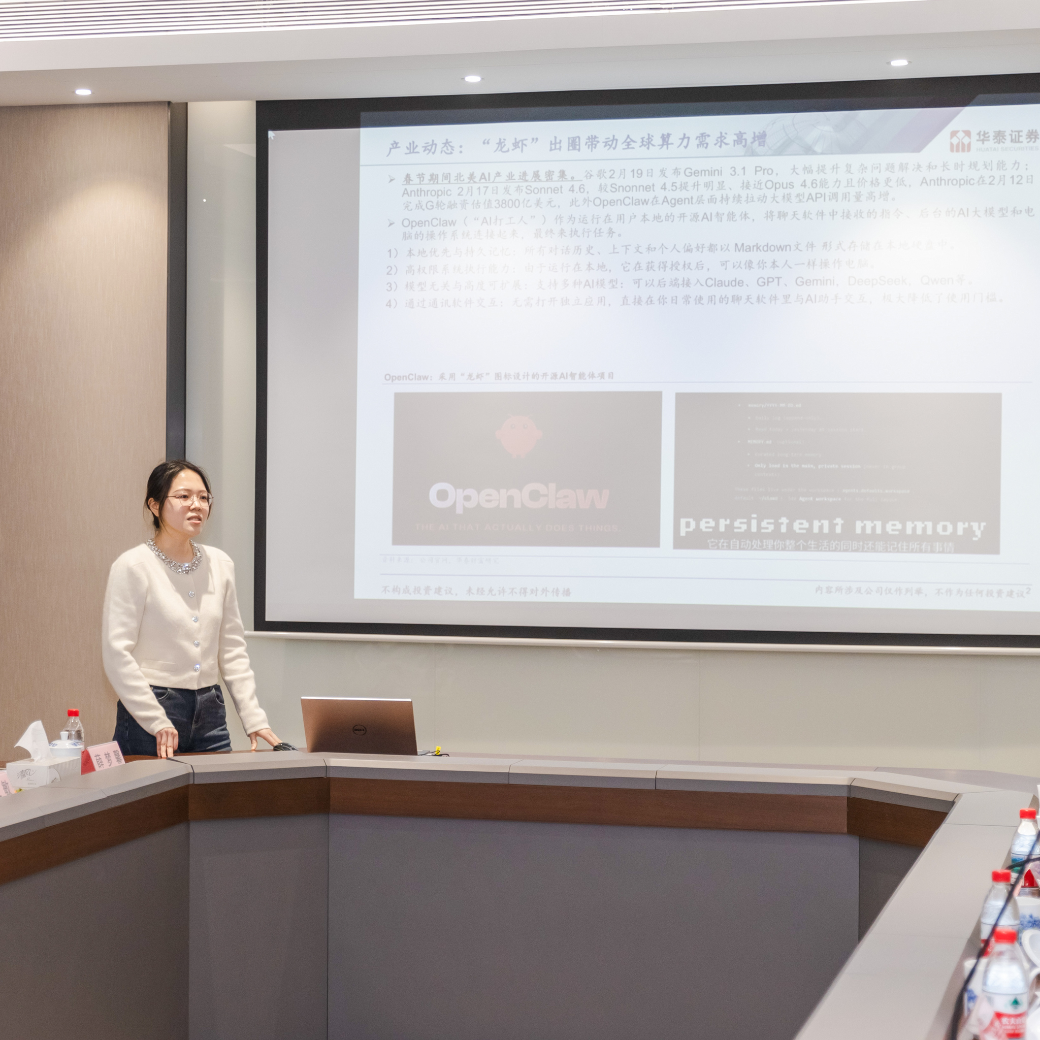 主题交流环节,华泰证券负责人郑亚敏系统阐述资本市场赋能新质生产力的创新路径与政策导向。华泰证券研究所科技行业研究员薛梦鑫以《科技掘金:在不确定中寻找确定性》为题作专题分享,立足当前宏观经济形势与科技产业发展趋势,解读人工智能驱动下的算力、存储、光通信、半导体设备等重点赛道发展机遇,梳理科技产业演进新趋势与结构性变革方向,为青年企业家把握行业趋势、布局创新赛道提供参考。