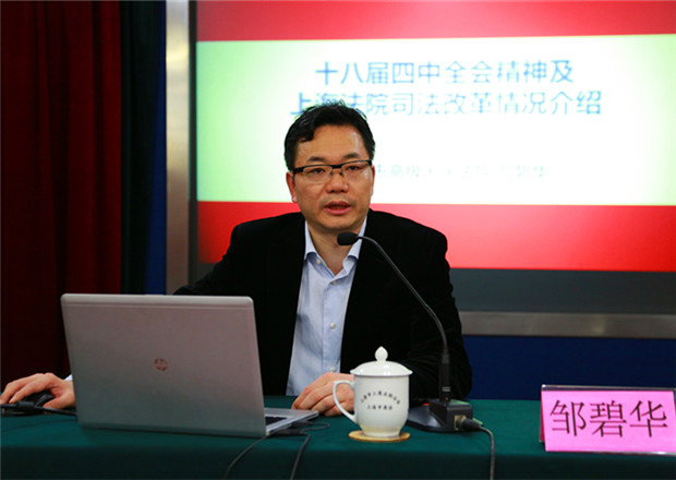 邹碧华副院长在两个小时的时间里,结合我国法制建设的历史脉络和十八届三中、四中全会关于全面深化改革决定中的有关推进法治中国建设的重要表述,对全面推进依法治国若干重大问题作了生动解读;同时,就上海在法治建设推进方面的背景、实施和预期作了较为详实的介绍。报告会受到大家的欢迎。