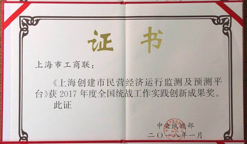 近日,上海市工商联“创建上海市民营经济运行监测及预测平台”工作被中央统战部评为2017年度全国统战工作实践创新成果奖。