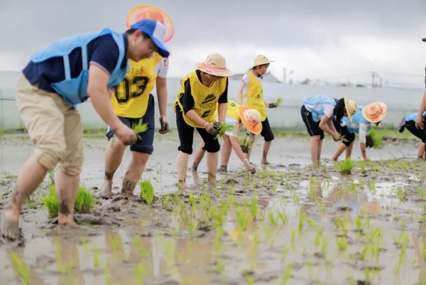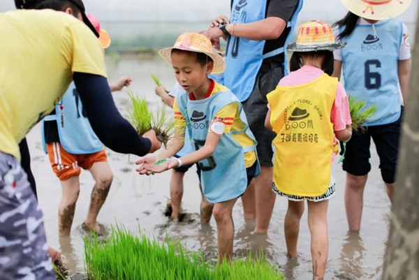 抬头是蓝天白云,脚下是美丽的郊野大地。只见孩子和大人们一同踩在湿漉漉的泥巴里,拿起一颗颗嫩绿的秧苗,一步一坑。“手掐着秧苗的根部,把它插进泥里,边插要边往后退……”工作人员一边讲解插秧的技巧和注意事项,一边示范正确的插秧方法。大人和孩子们听得津津有味,左手拿秧,右手握苗,把一株株幼苗插进了泥田中,学得有模有样,纷纷挽起袖子,半蹲在农田中,把秧苗一根根植入田里。