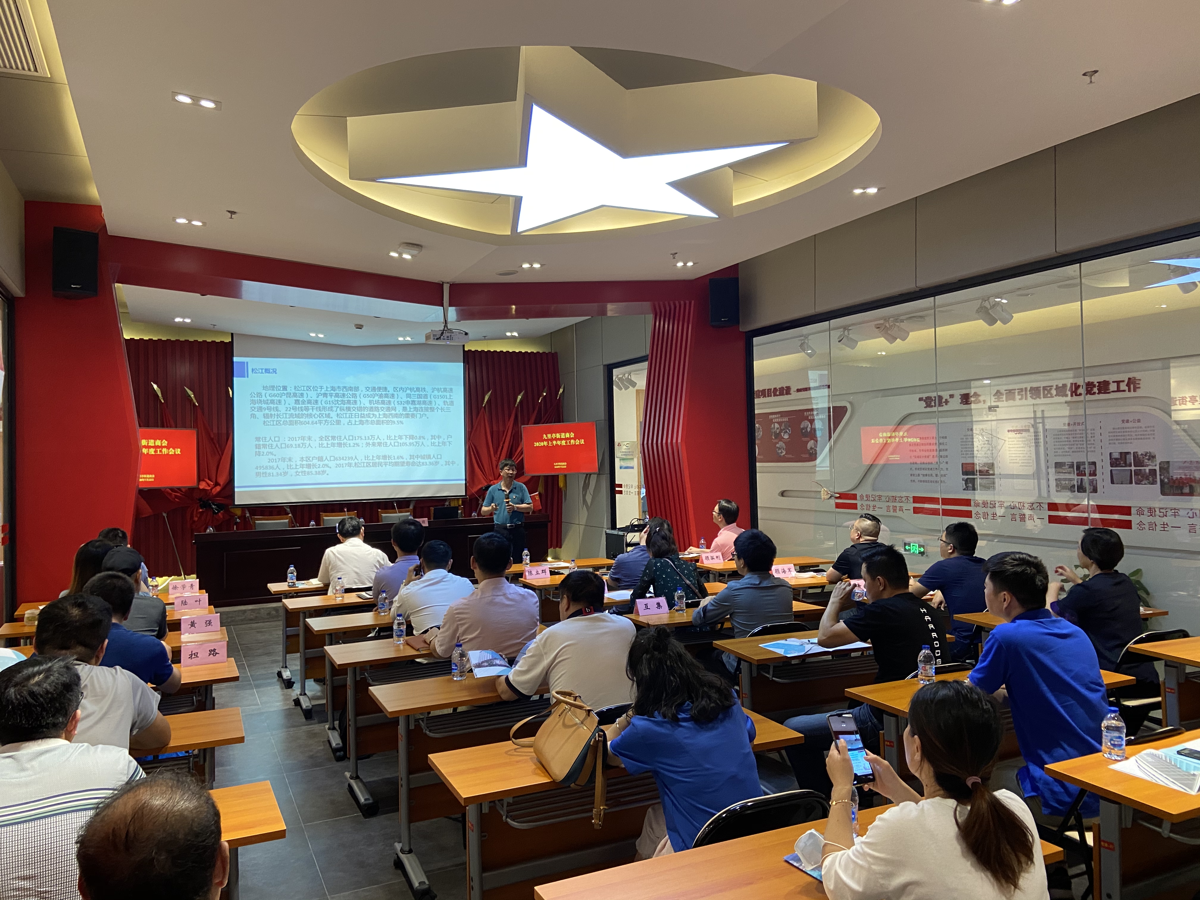 7月22日下午,松江区工商联九里亭街道商会召开2020年上半年度工作会议。街道商会名誉会长、街道党工委副书记邱敦凤,街道商会会长、上海佳铭房产有限公司董事长徐学青,街道商会常务副会长、街道党工委委员、办事处副主任汤瑜泳出席。会议由街道商会秘书长、街道党工委委员、人大工委副主任俞永新主持。30余家街道商会成员单位近50人参加。