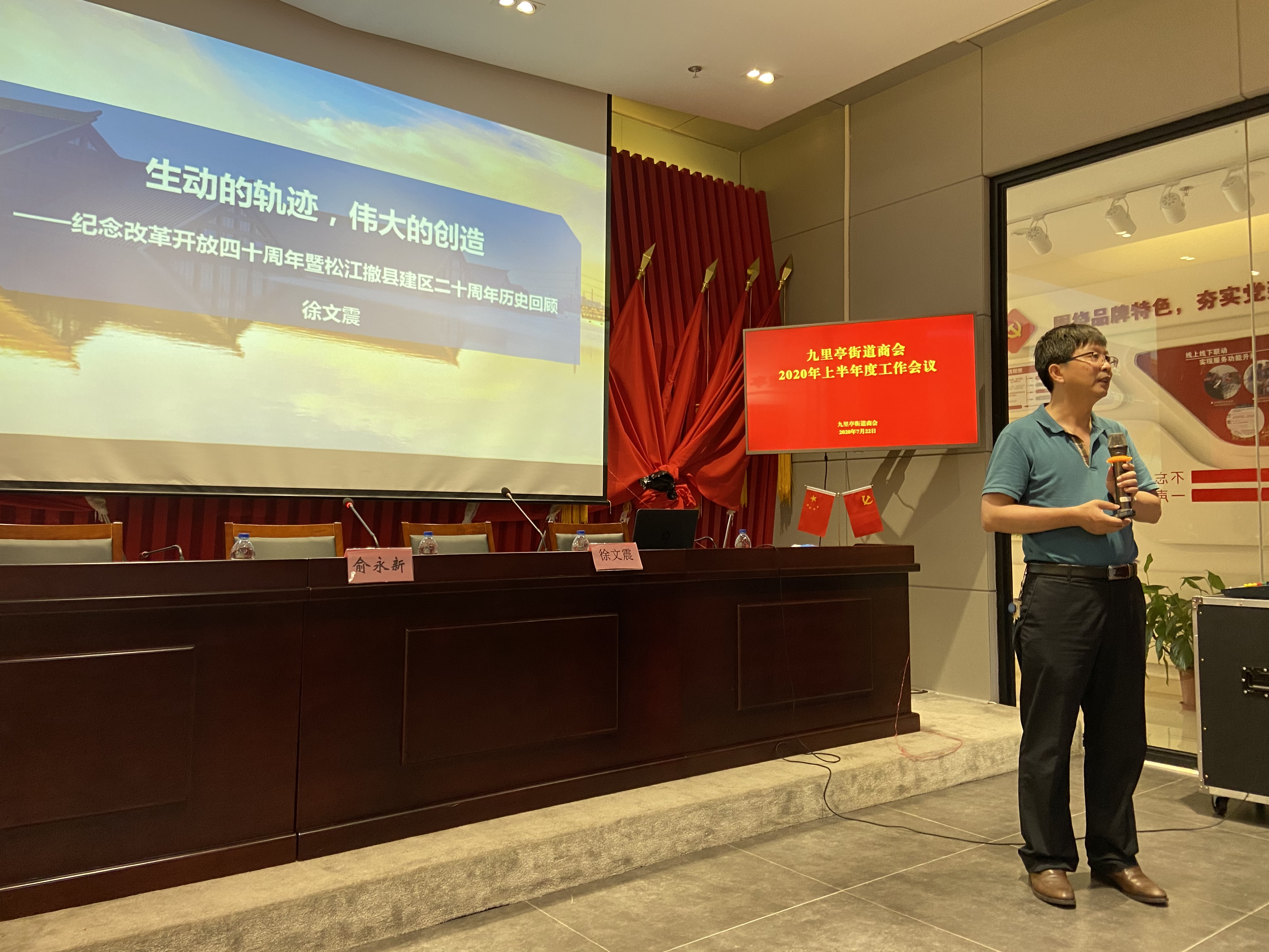 会前,九里亭街道商会特邀区委党校教研室主任、副教授徐文震作“四史”教育专题讲座。徐文震教授紧紧围绕“生动的轨迹、伟大的创造——松江改革开放史”这一主题,从松江的经济发展、体制改革、城镇变化等方面回顾了我国改革开放40年来松江取得的辉煌成就,进一步激发了商会成员立足新时代、奋力新作为、创造新业绩的热情。