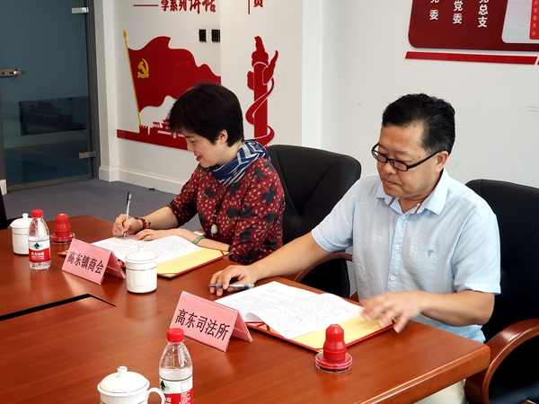 8月17日,浦东新区高东镇商会和高东镇司法所在高东镇商会举行共建签约仪式。高东镇商会会长周秀琴和高东镇司法所所长应健签署共建协议,高东镇党委副书记包铭星,镇党委委员、商会秘书长陈晖等出席签约仪式。