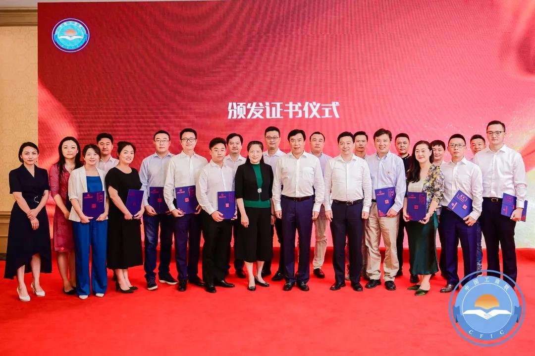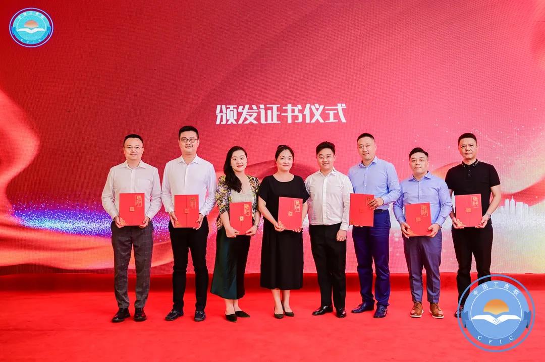 当选会长(理事长)、上海新湖房地产开发有限公司董事长黄立程向商会秘书长、副秘书长颁发聘书。