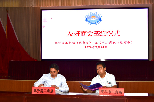 为扎实推进长三角一体化发展战略,更好地促进上海市奉贤区和江苏省宜兴市两地工商联及企业的交往与协作,有效发挥两地商会的桥梁纽带作用,9月24日,上海市奉贤区工商联和江苏省宜兴市工商联在宜兴市官林镇政府召开对接交流会,并缔结成友好商会。