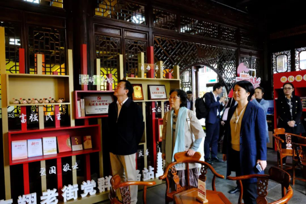 10月28日,全国工商联互学互促工作小组来南翔调研全国“四好”商会工作。全国“四好”商会互学互促组成员、广西自治区工商联党组成员、副主席吴振秋,上海市工商联党组成员、副主席杨茜等在东社区邻里中心和南翔老街开展现场调研。嘉定区工商联副主席陈攀、南翔镇党委副书记姚芳陪同。