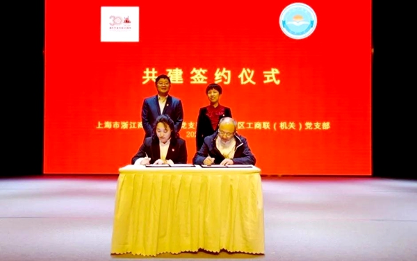 会上,沈浩代表浦东新区工商联党支部,俞秋勤代表上海市浙江商会秘书处党支部举行了共建签约仪式,姚琼、吴仲春共同见证双方签约。