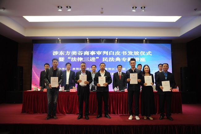 为进一步优化区域营商环境,精准对接司法服务保障东方美谷建设的着力点和切入点,有力回应企业司法需求看,11月17日下午,奉贤区工商联、奉贤区法院举行《2019-2020上半年涉东方美谷商事案件审判白皮书》发放仪式暨“法律三进”民法典专题讲座活动。区委统战部副部长、区工商联党组书记张青,区法院党组成员、副院长苏建忠,东方美谷公司党委书记、董事长李亿等出席活动。区工商联会员企业代表、区人大代表、政协委员、人民陪审员和相关媒体记者等60余人参加活动。活动由区工商联党组成员、副主席刘海华主持。