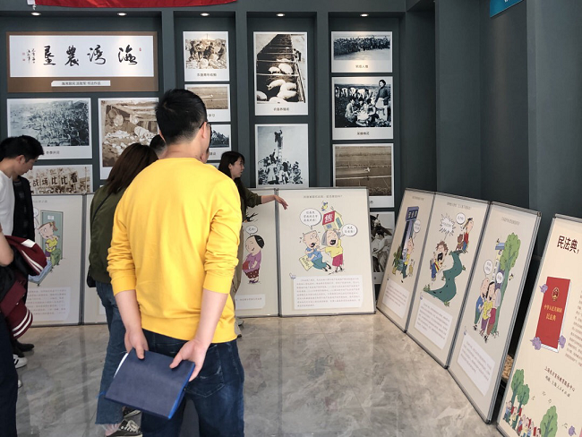 活动中,普法工作人员向企业管理者展示《民法典》宣传版面,并引导企业关注和使用“12348”上海法网以及“海湾尚法”小程序。