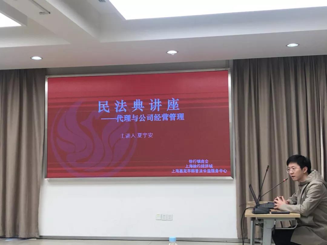 11月20日下午,嘉定区徐行镇商会在盛创企业家园举办民法典专题培训会,邀请上海嘉定萃群普法公益服务中心讲师夏宇安作“民法典之代理与公司经营管理”专题培训,20余家商会企业代表参加。