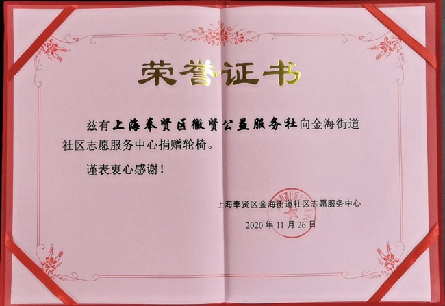 奉贤区徽贤公益服务社筹备成立后的第一件事,就是向奉贤区金海街道社区志愿服务中心捐赠5辆轮椅,让金海街道行动不便的残疾人和老人享受到生活的便利。