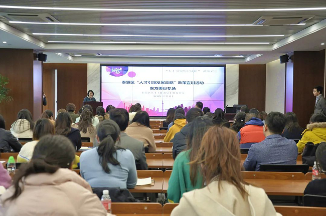 为贯彻落实市委、市政府《关于新时代上海实施人才引领发展战略的若干意见》精神,加快人才政策落地,提高奉贤生物科技园区人才工作者政策知晓度和业务能力水平,12月4日,奉贤区人才工作领导小组办公室在东方美谷集团二楼报告厅举办“人才引领发展战略”政策宣讲活动(东方美谷专场)。区委组织部副部长、区人才办主任洪萍,区人社局党组成员、副局长张卫锋出席活动。会议由东方美谷企业集团党委副书记、工会主席钟慧英主持。伽蓝、莱士、雪榕等20家园区商会企业,以及辖区民营企业人事干部共计65人参加会议。