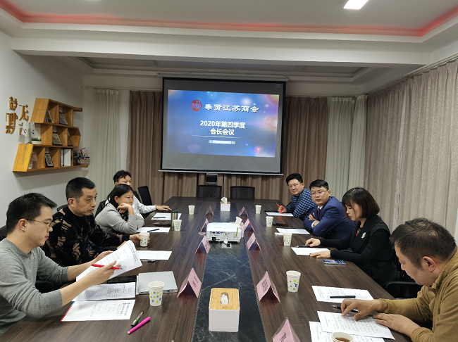 12月29日下午,奉贤区工商联江苏商会在奉浦街道新时代文明实践分中心会议室召开2020年第四季度会长会议。区工商联江苏商会会长吴彩琴,常务副会长翟杰、谢爱兵、陈明清、韩佩伦、赵怀庆及秘书处参加会议。
