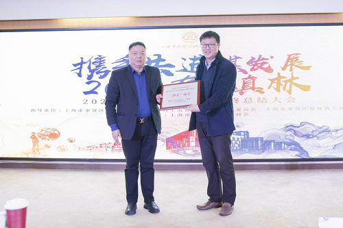 李晶向镇商会常务副会长颁发奉贤区工商联(总商会)“四好商会”奖牌。