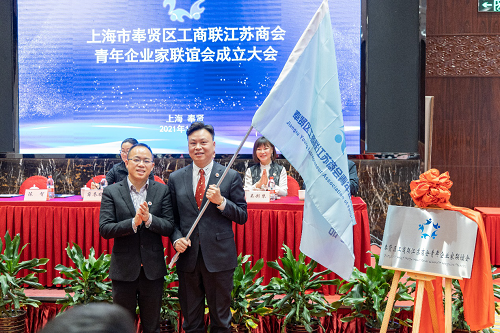 陈智代表区青年商会向区工商联江苏商会青年企业家联谊会授旗