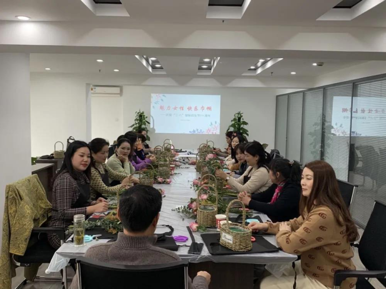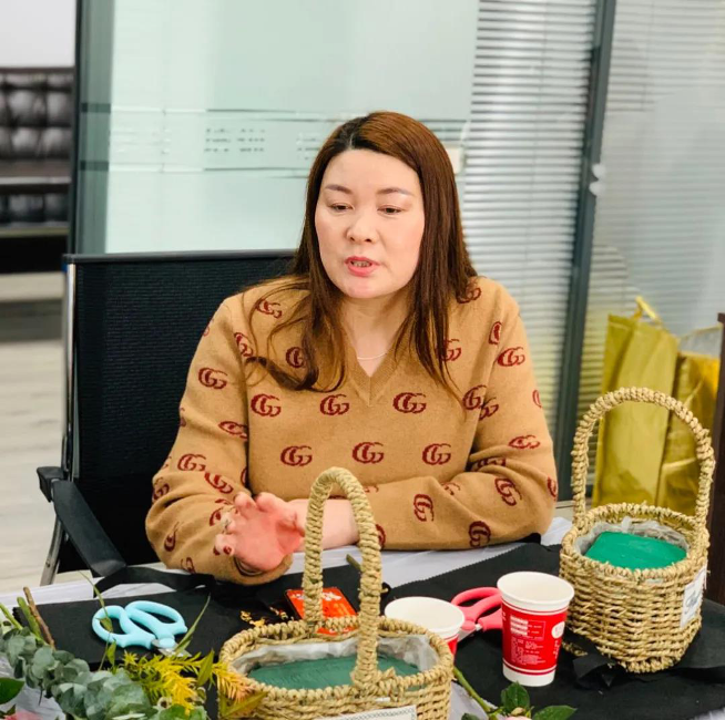 在她们的巧手装扮下,一朵朵鲜花、一枝枝绿叶变成了一盆盆五彩缤纷、娇艳欲滴的花篮。现场弥漫着花香,洋溢着姐妹们的欢声笑语。