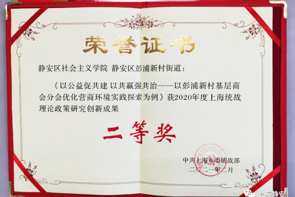 在2020年度上海市统战理论政策研究创新成果创建评估工作中,静安区彭浦新村街道联合静安区社会主义学院报送的《以公益促进共建 以共赢强共治——以彭浦新村街道基层商会分会优化营商环境实践探索为例》荣获全市统战理论政策研究创新成果二等奖,成为全市荣获此殊荣的两个街道之一。