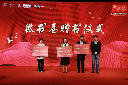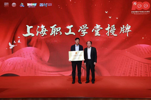 金汇镇党委副书记周志军为上海职工学堂授牌,奉贤区文化和旅游局副局长王滢涛和金汇镇人大副主席、总工会主席陈惠英分别向微书屋和职工书屋赠书。