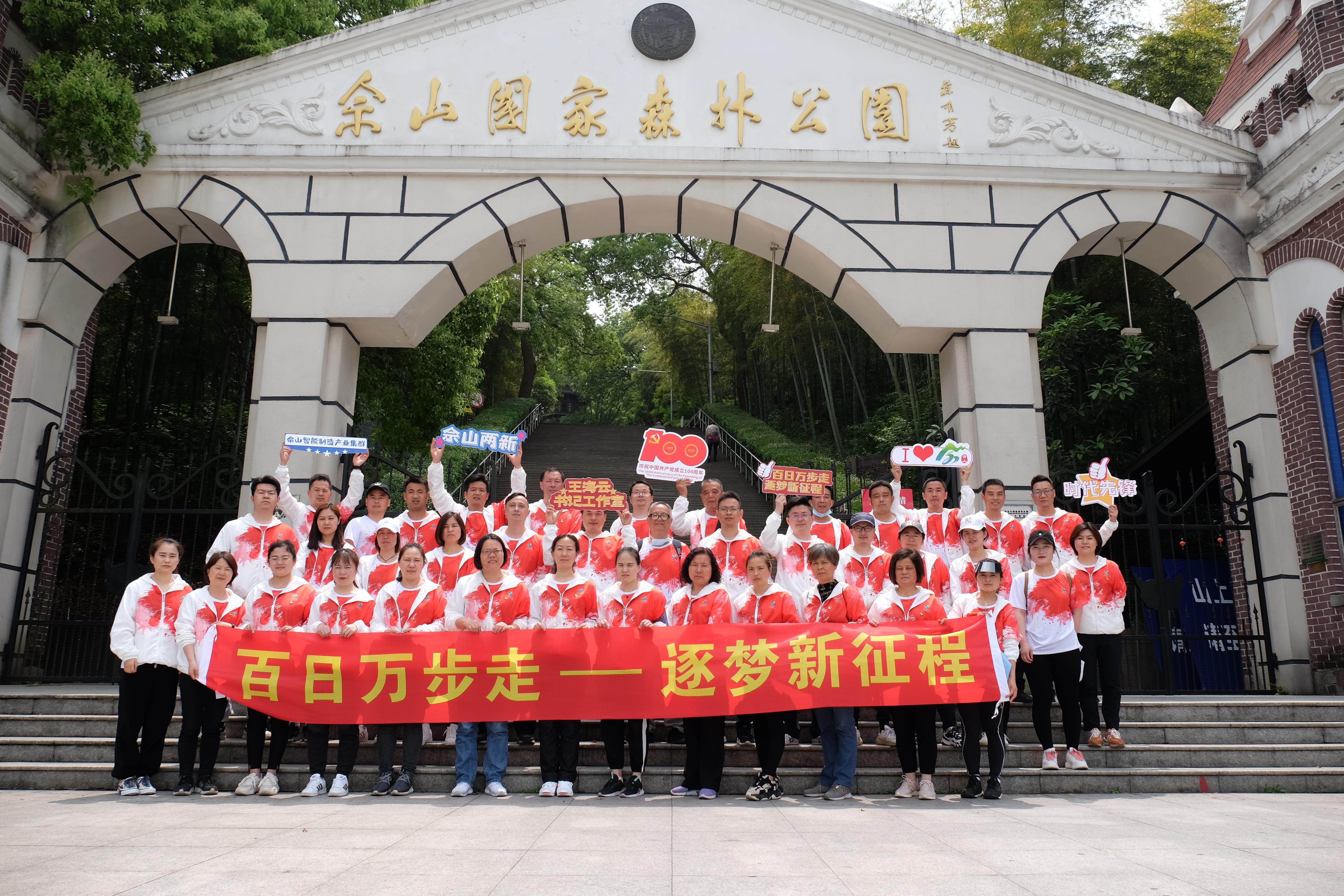 本次活动分别在4个景点精心设计了不同的打卡任务,每一组以佘山国家森林公园北大门为起点出发,沿着规定的路线一路向前,向“佘山之巅”纪念碑为目的地奋力攀登。大家通过分组分成了9个组,并取好队名、口号。每组都高举队旗,分别有先锋队、峰起云涌队、枪炮玫瑰队、云之队和康康队等。大家你追我赶,勇往直前,气氛热烈,整个登山过程充满了活泼、愉快的气氛。党史知识竞答环节,大家都跃跃欲试,想为自己的队伍争取更好的成绩;“勠力同心”环节极具趣味性,考验大家的默契程度,团队相互配合、有效沟通是取胜的关键。