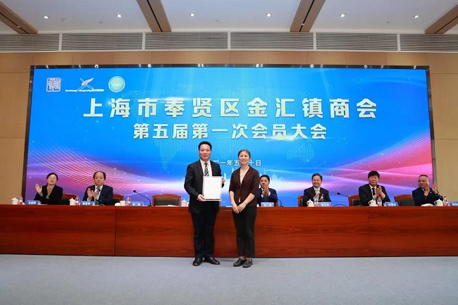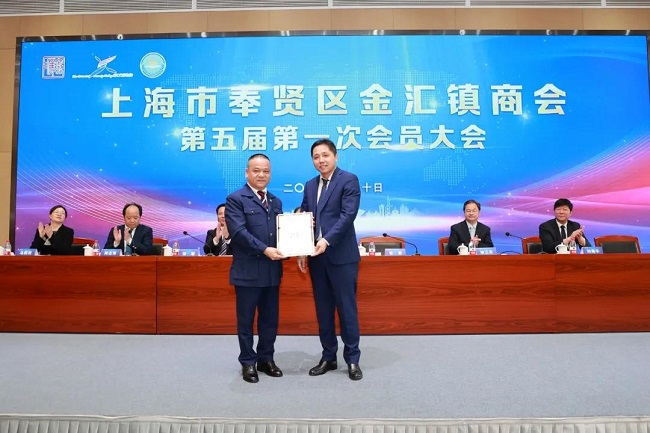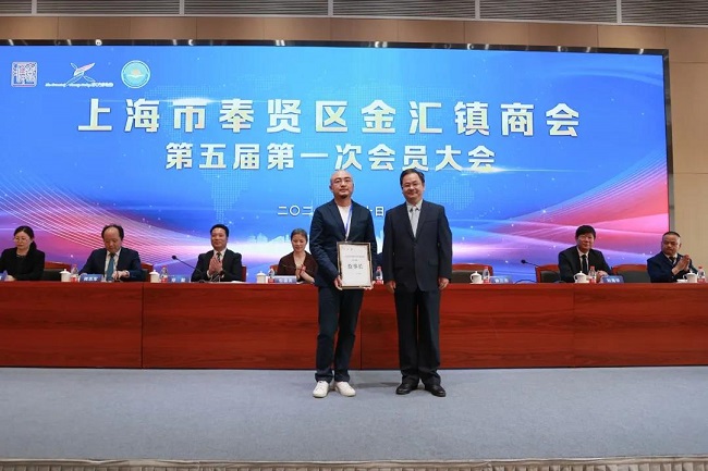 黄海瑚为金汇镇商会秘书长陈军辉颁发证书。