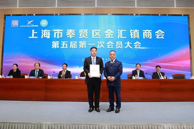 区民政局党组成员、副局长、区社会组织管理局副局长徐三忠为金汇镇商会监事长徐忠颁发证书。