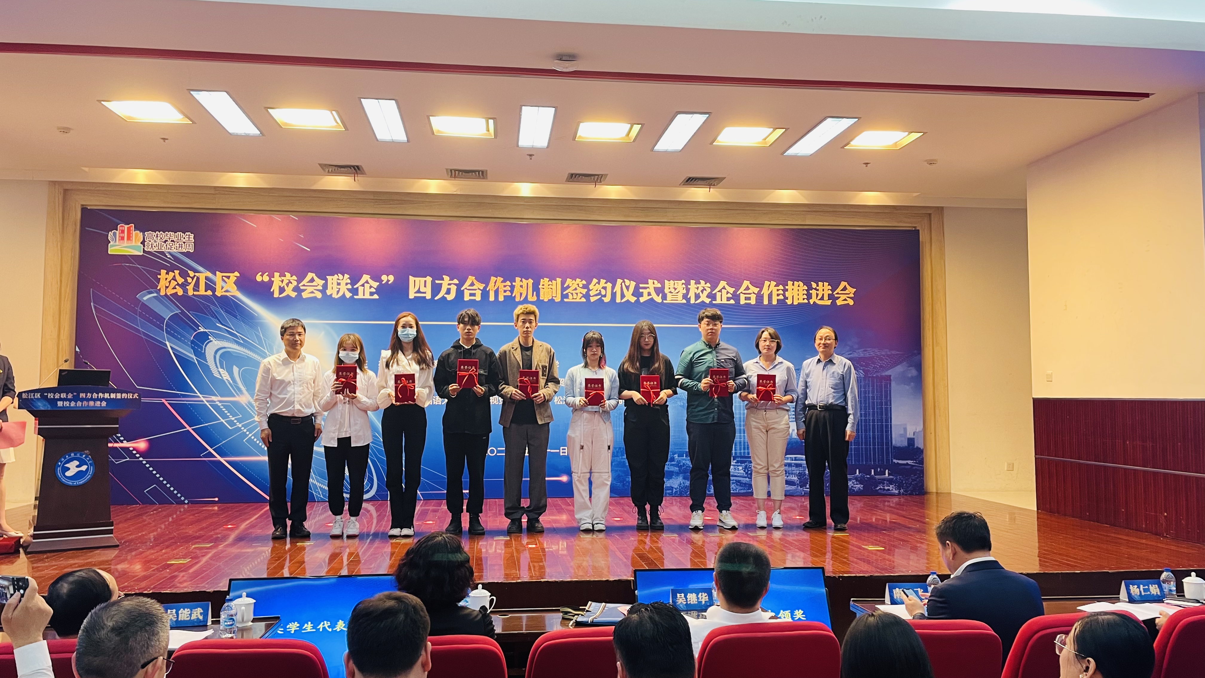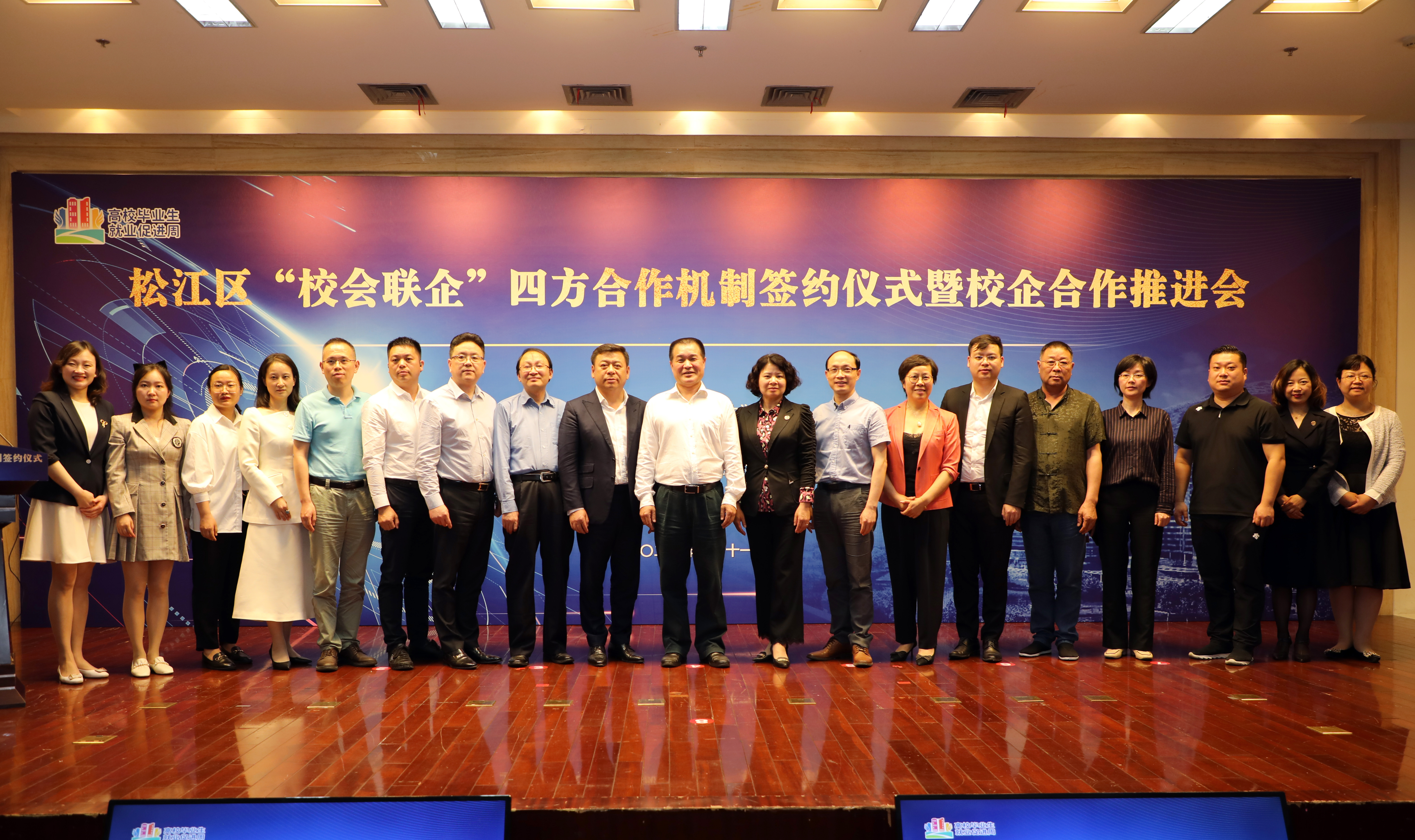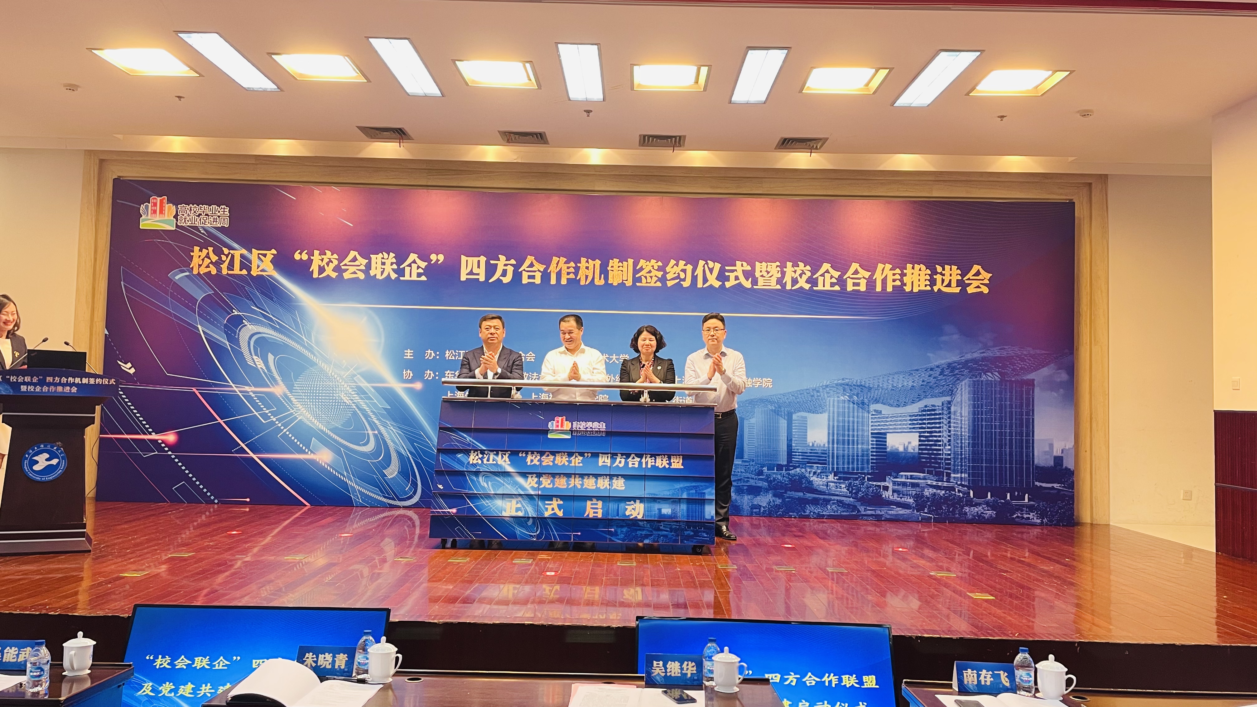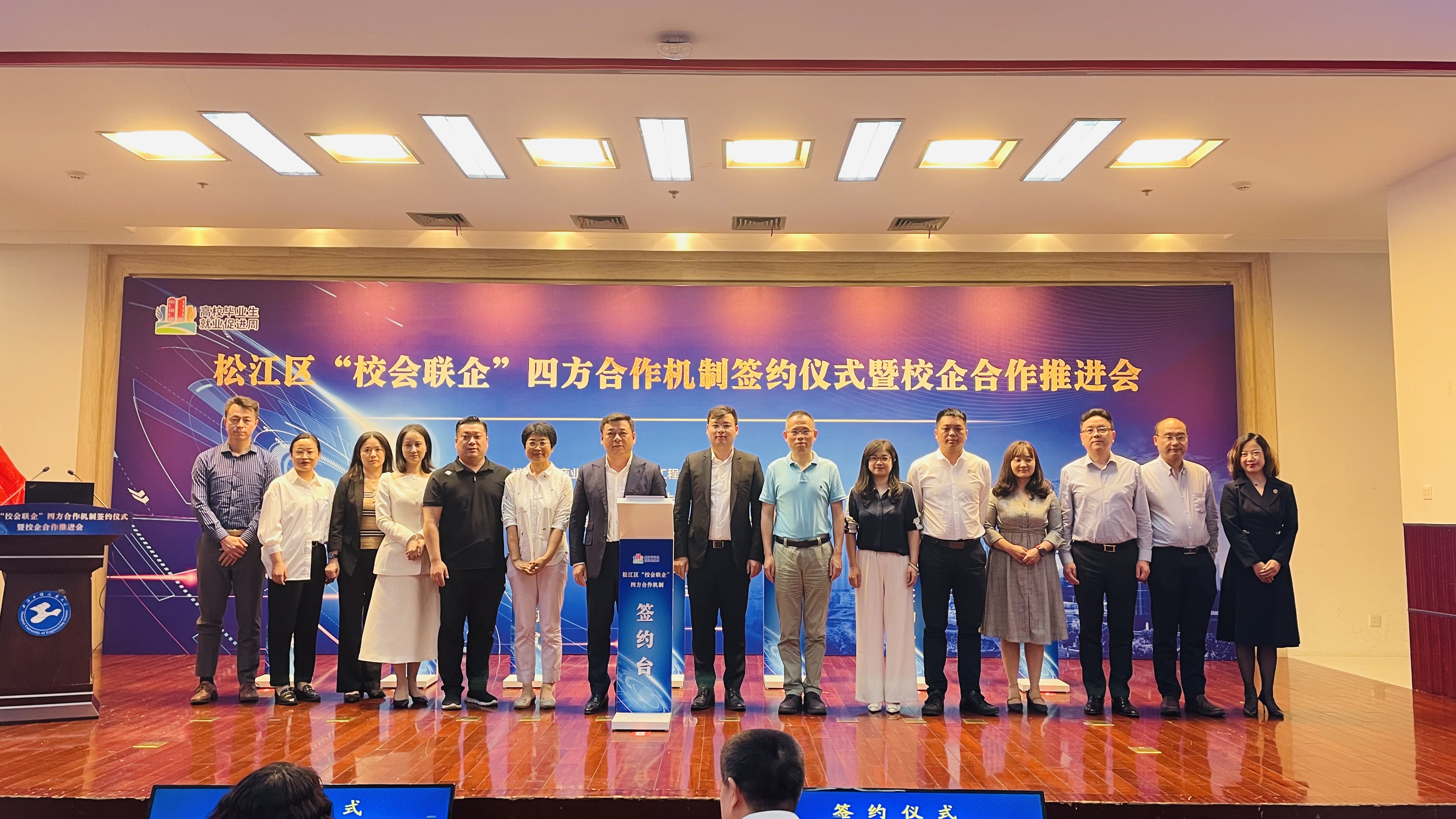 松江大学城7所高校、寰泰能源股份有限公司等7位企业代表、松江区工商联、松江区总商会及其所属商会签署了松江区“校会联企”四方合作机制战略合作协议。吴能武和杨仁娟为“松江大学城大学生职业生涯教育暨就业创业实践基地”揭牌。