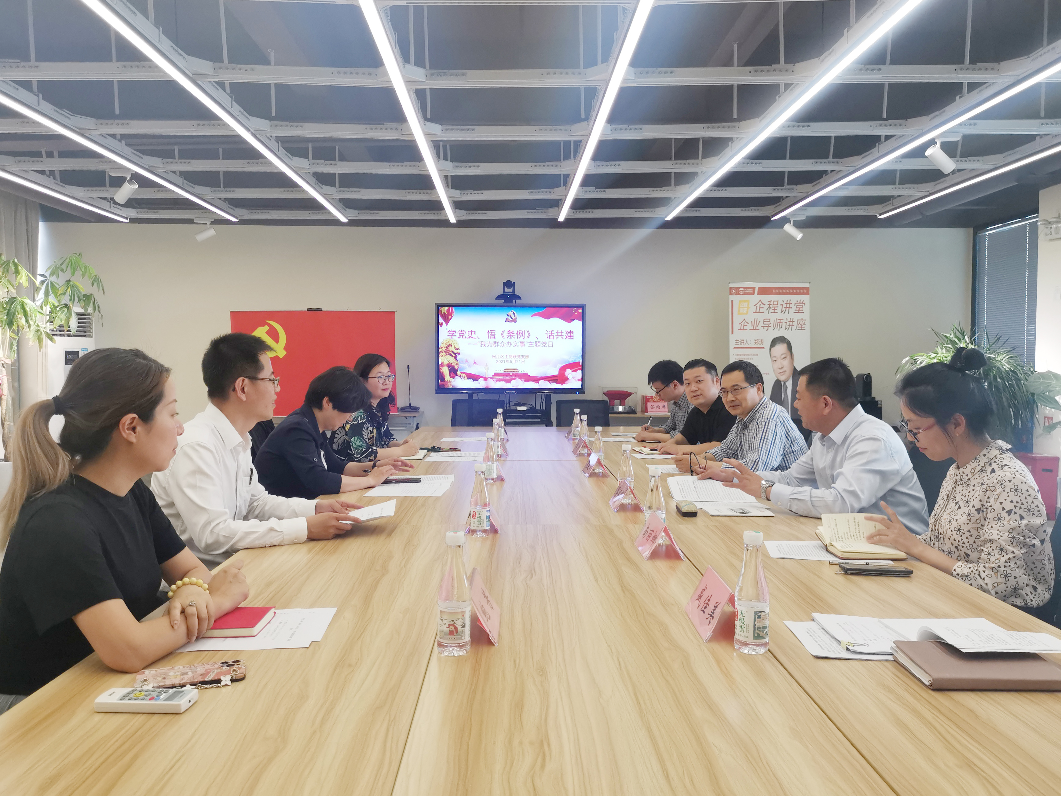 5月21日下午,松江区工商联党支部联合上海工程技术大学组织党员干部,赴上海咏姿时装有限公司开展三方联学党史、悟《条例》、话共建——“我为群众办实事”主题党日。活动由区工商联党组成员、副主席、党支部书记蔡留富主持。区工商联党组成员、副主席袁建峰,工程大纺织服装学院党委书记朱君璇,上海咏姿时装有限公司总经理郑涛等参加。