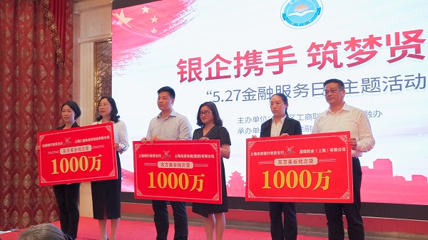 在贷款发放仪式上,7家银行代表分别向7家企业代表发放贷款。