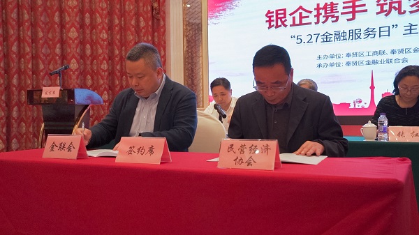 赵建平与区民营经济协会常务副会长叶明正分别代表区金融业联合会和区民营经济协会签订合作协议。