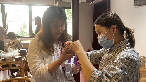 当大家移步至东兴茶楼时,更是格外地兴奋。茶楼位于庄行镇东街17号,“有着一座茶楼、半部庄行史”的说法。开发区商会还专门邀请中医药大学李娜老师传授香囊的制作方法。大家在东兴茶楼品味着粽子,学做香囊,如同在家的感觉,格外地温馨。
