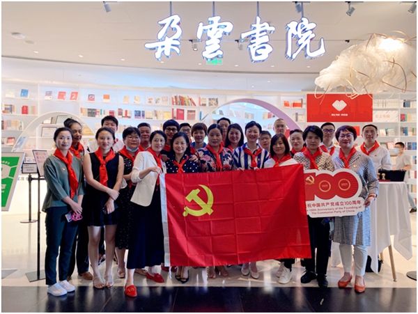 在离地239米的空中、2000多平方米的朵云书院空间内,有着6万多册中外书籍。商会企业的党员和同志们纷纷驻足于建党100周年专架前,认真阅读了红色书籍,从书籍中汲取智慧,永褒共产党人的初心,不忘来时的路。